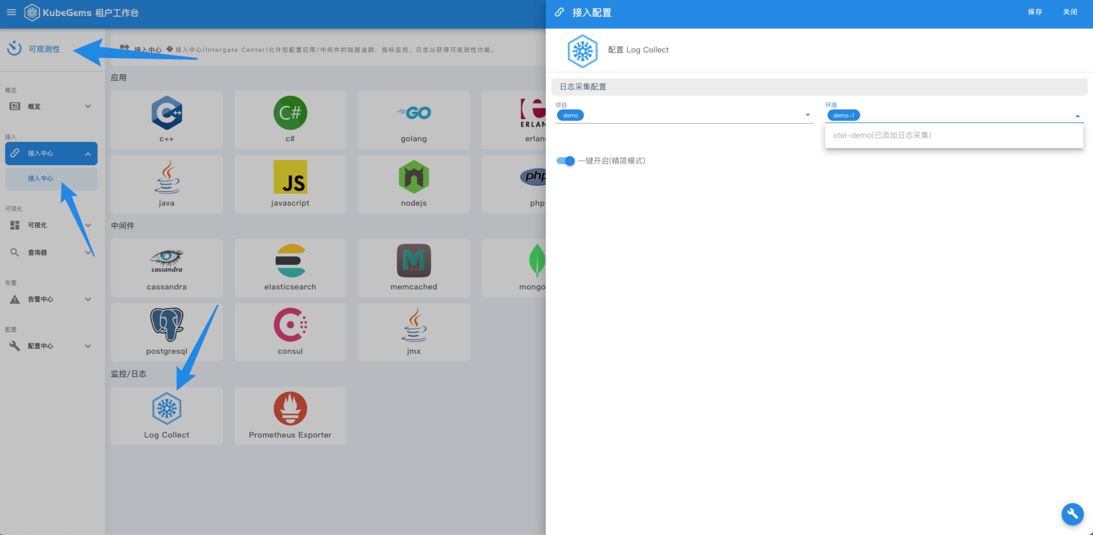 - 进入【可观测性】功能模块下的【接入中心】,选择 “Log Collect”。根据侧边栏提示选择需要采集日志的目标环境