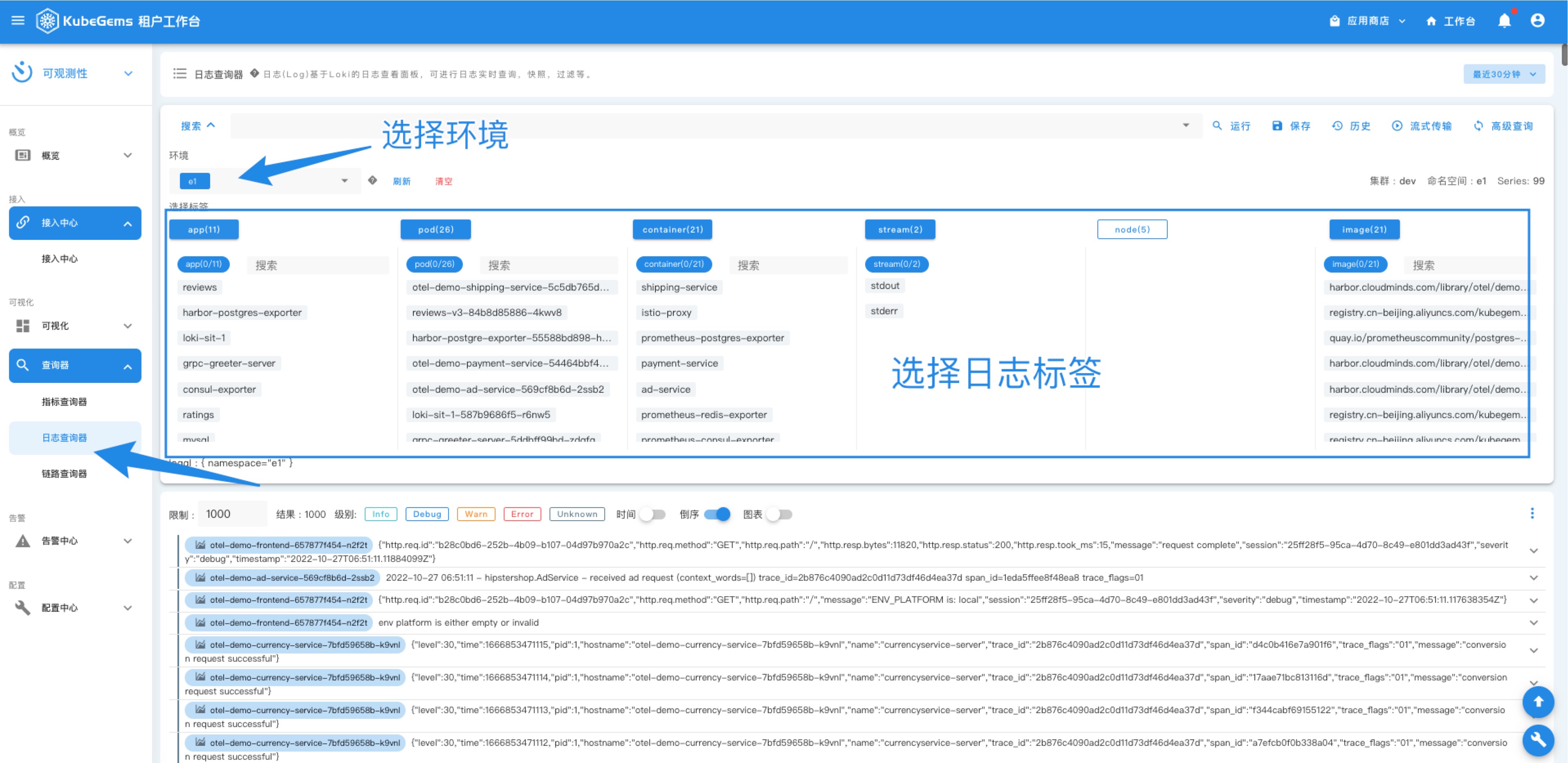 日志查看器是 KubeGems 可观测性中进行日志分析最重要的模块,用户在此页面可以查询应用日志并进行一些LogQL 的高级查询。在此页面聚合了租户环境下应用所有入库的日志,并提供了时间筛选、流式传输、日志下载和历史等常见功能方便使用者管理日志。